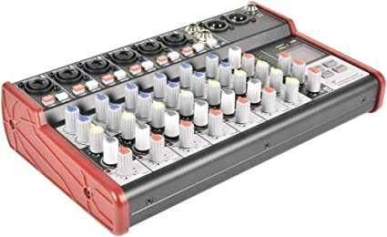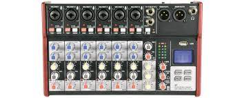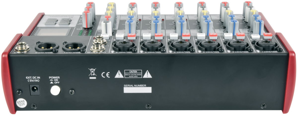 Compact format audio mixer with 2, 4 or 6 mono input channels and a stereo line input. Each mono channel has a combo XLR/jack input with individually switchable mic/instrument impedance and +48V phantom power for the XLR. Input channels have High/Low EQ and Pan controls and mono channels also have Effects level to vary the amount of internal digital delay effect added for vocals or instruments. An internal player/recorder with the backlit display can accept a USB memory stick containing compressed audio files in various formats or alternatively connect to a smartphone via BT wireless link. The output is delivered on a pair of balanced XLR connectors and offers very low noise operation for high-quality studio or live performances.